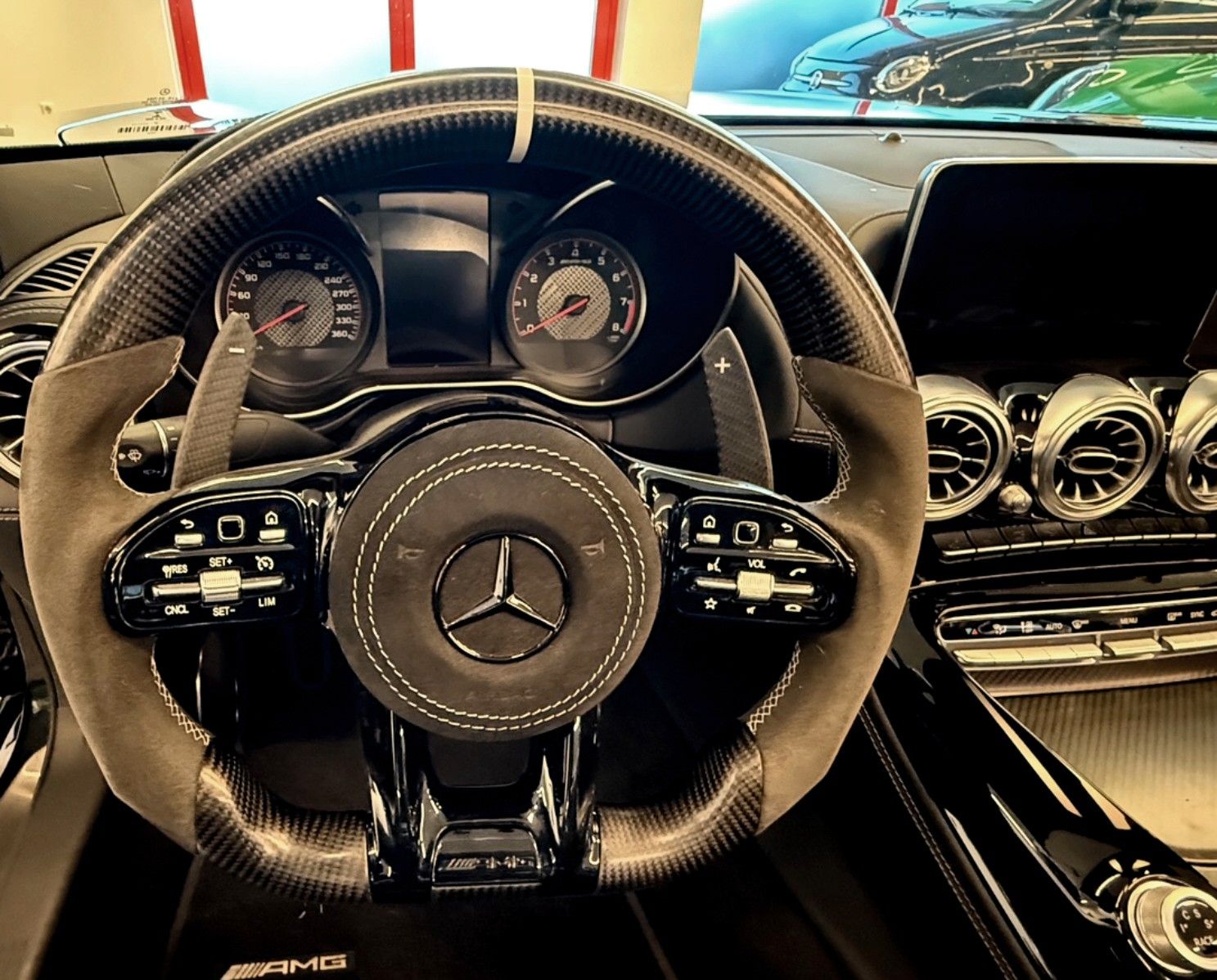 AMG Track Pace (APP), Audio-Navigationssystem: COMAND Online, Einstiegsleisten (AMG) beleuchtet, Exterieur-Paket Carbon (AMG), Fahrassistenz-Paket: Spur, Fahrassistenz-System: Fernlichtassistent Adaptive, Fahrassistenz-System: Verkehrs-Informations-System Live Traffic, Kopfraumheizung (Airscarf), Kraftstofftank: vergrößert, Lenkrad (AMG Performance, Dinamica), LM-Felgen vorn/hinten:Sonderfelgen 9x20 / 11x21 in mattschwarz), Media Interface (Universal-Schnittstelle für iPod / AUX / USB / MP3), Memory-Paket, Metallic-Lackierung, Parktronic-System PTS (vorn und hinten), Reifen-Reparaturset (Tirefit), Rückfahrkamera, Sender für Garagentoröffner (integriert), Sitze vorn: Klimatisierung, Spiegel-Paket, Sportsitze AMG Performance, Surround-System Burmester, Vorrüstung Mobiltelefon/Handy / Komfort-Telefonie / LTE-fähig, Windschott Glas (Airguide)