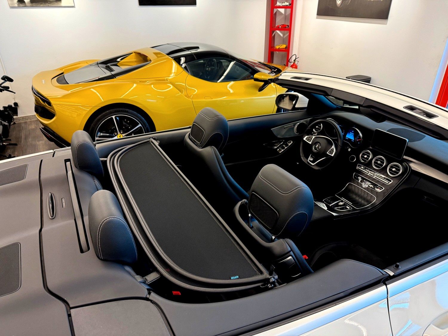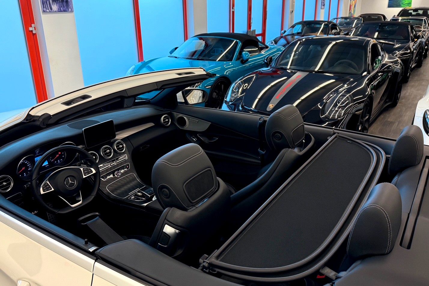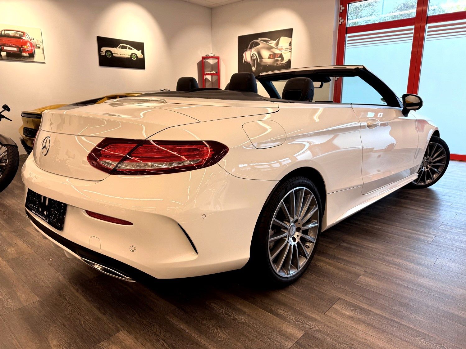 Akustik-Verdeck schwarz, Ambiente-Beleuchtung, AMG-Line Interieur, Audiosystem Audio 20 (mit Farbdisplay), Bereifung mit Notlaufsystem, Cabrio-Komfort-Paket, Fahrassistenz-System: aktiver Park-Assistent, Fahrassistenz-System: Fernlichtassistent Adaptive plus, Heckdeckelverriegelung separat, Infotainment-System: Remote Online, Intelligent Light System LED, Keyless Go Startanlage, Komfort Direktlenkung, Kraftstofftank: vergrößert, LM-Felgen vorn/hinten: 7,5x19 / 8,5x19 (AMG, Vielspeichen), Park-Paket, Sitz-Komfort-Paket, Sitzheizung vorn, Spiegel-Paket, Touchpad mit Drehknopf (Mittelkonsole), Vorbereitung Navigationssystem (Garmin MAP Pilot), Zeituhr (Analog)